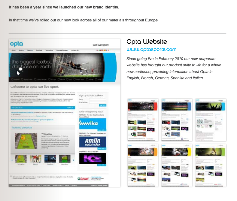 When I first started Kwwika I got in touch with Opta Sports. One of the reasons I decided to leave Caplin (although, as you know, I haven't) was their financial focus. I would have preferred to see the technology applied to something I have more interest in and I'm interested in sport so this was a great first target. We started work on the Real-Time Opta Sports Cricket widget - powered by Kwwika in November and it was ready during December. I'm really excited to see Opta Sport's data streaming through Kwwika and I'm really hopefully that cricket data is just the start. I was particularly proud when Opta put the Kwwika logo on their homepage. And because Opta then released the Opta Annual 2010 we are also in the brochure. An awesome feeling!
